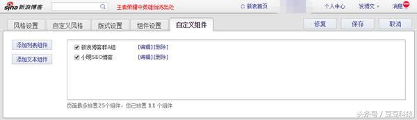具體的做法,把鏈接做成錨文本的形式,就是用上述的“昵稱”作為關鍵詞就行,然后把它們放到表格中,隨機打亂,分成數量不一的不同小組。然后將這若干的新浪博客小組群隨機添加一組到單個新浪博客上面,具體的步驟是:點擊新浪博客頁面設置,然后直接添加文本組件就可以了,如下圖: