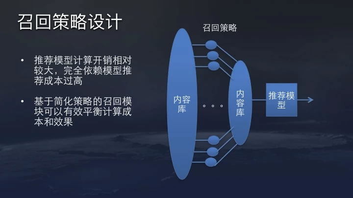 但因為頭條目前的內(nèi)容量非常大,加上小視頻內(nèi)容有千萬級別,推薦系統(tǒng)不可能所有內(nèi)容全部由模型預估。所以需要設(shè)計一些召回策略,每次推薦時從海量內(nèi)容中篩選出千級別的內(nèi)容庫。召回策略最重要的要求是性能要極致,一般超時不能超過50毫秒。