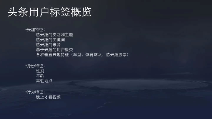今日頭條常用的用戶標簽包括用戶感興趣的類別和主題、關(guān)鍵詞、來源、基于興趣的用戶聚類以及各種垂直興趣特征(車型,體育球隊,股票等)。還有性別、年齡、地點等信息。性別信息通過用戶第三方社交賬號登錄得到。年齡信息通常由模型預測,通過機型、閱讀時間分布等預估。常駐地點來自用戶授權(quán)訪問位置信息,在位置信息的基礎(chǔ)上通過傳統(tǒng)聚類的方法拿到常駐點。常駐點結(jié)合其他信息,可以推測用戶的工作地點、出差地點、旅游地點。這些用戶標簽非常有助于推薦。