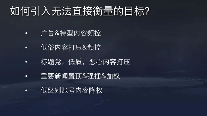 此外,平臺出于內(nèi)容生態(tài)和社會責任的考量,像低俗內(nèi)容的打壓,標題黨、低質(zhì)內(nèi)容的打壓,重要新聞的置頂、加權(quán)、強插,低級別賬號內(nèi)容降權(quán)都是算法本身無法完成,需要進一步對內(nèi)容進行干預。