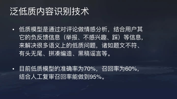 泛低質(zhì)識別涉及的情況非常多,像假新聞、黑稿、題文不符、標題黨、內(nèi)容質(zhì)量低等等,這部分內(nèi)容由機器理解是非常難的,需要大量反饋信息,包括其他樣本信息比對。目前低質(zhì)模型的準確率和召回率都不是特別高,還需要結(jié)合人工復審,將閾值提高。目前最終的召回已達到95%,這部分其實還有非常多的工作可以做。頭條人工智能實驗室李航老師目前也在和密歇根大學共建科研項目,設(shè)立謠言識別平臺。