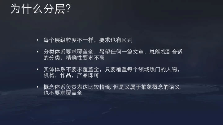 分類的目標是覆蓋全面,希望每篇內(nèi)容每段視頻都有分類;而實體體系要求精準,相同名字或內(nèi)容要能明確區(qū)分究竟指代哪一個人或物,但不用覆蓋很全。概念體系則負責解決比較精確又屬于抽象概念的語義。這是我們最初的分類,實踐中發(fā)現(xiàn)分類和概念在技術(shù)上能互用,后來統(tǒng)一用了一套技術(shù)架構(gòu)。