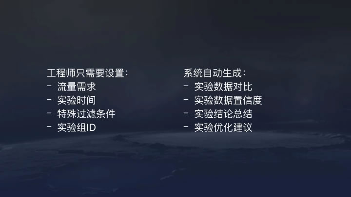 在這個系統(tǒng)下工程師只需要設(shè)置流量需求、實驗時間、定義特殊過濾條件,自定義實驗組ID。系統(tǒng)可以自動生成:實驗數(shù)據(jù)對比、實驗數(shù)據(jù)置信度、實驗結(jié)論總結(jié)以及實驗優(yōu)化建議。