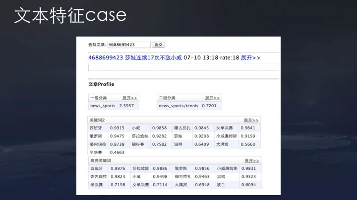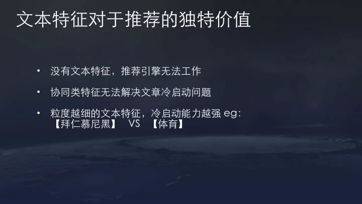 上圖是今日頭條的一個實際文本case。可以看到,這篇文章有分類、關(guān)鍵詞、topic、實體詞等文本特征。當然不是沒有文本特征,推薦系統(tǒng)就不能工作,推薦系統(tǒng)最早期應用在Amazon,甚至沃爾瑪時代就有,包括Netfilx做視頻推薦也沒有文本特征直接協(xié)同過濾推薦。但對資訊類產(chǎn)品而言,大部分是消費當天內(nèi)容,沒有文本特征新內(nèi)容冷啟動非常困難,協(xié)同類特征無法解決文章冷啟動問題。