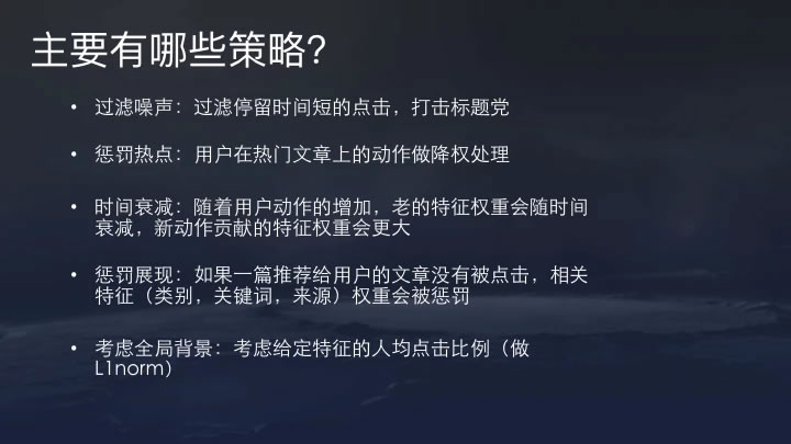 當然最簡單的用戶標簽是瀏覽過的內(nèi)容標簽。但這里涉及到一些數(shù)據(jù)處理策略。主要包括:一、過濾噪聲。通過停留時間短的點擊,過濾標題黨。二、熱點懲罰。對用戶在一些熱門文章(如前段時間PG One的新聞)上的動作做降權(quán)處理。理論上,傳播范圍較大的內(nèi)容,置信度會下降。三、時間衰減。用戶興趣會發(fā)生偏移,因此策略更偏向新的用戶行為。因此,隨著用戶動作的增加,老的特征權(quán)重會隨時間衰減,新動作貢獻的特征權(quán)重會更大。四、懲罰展現(xiàn)。如果一篇推薦給用戶的文章沒有被點擊,相關(guān)特征(類別,關(guān)鍵詞,來源)權(quán)重會被懲罰。當然同時,也要考慮全局背景,是不是相關(guān)內(nèi)容推送比較多,以及相關(guān)的關(guān)閉和dislike信號等。