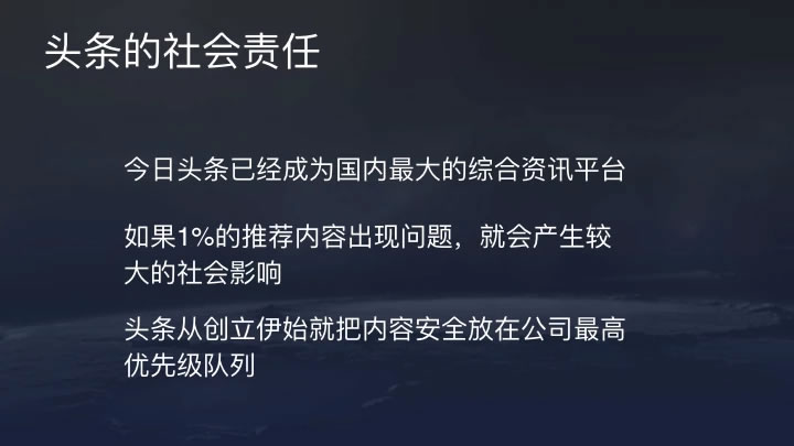 最后要介紹今日頭條在內(nèi)容安全上的一些舉措。頭條現(xiàn)在已經(jīng)是國內(nèi)最大的內(nèi)容創(chuàng)作與分發(fā)憑條,必須越來越重視社會責任和行業(yè)領(lǐng)導者的責任。如果1%的推薦內(nèi)容出現(xiàn)問題,就會產(chǎn)生較大的影響。