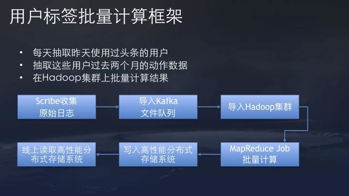 用戶標簽挖掘總體比較簡單,主要還是剛剛提到的工程挑戰(zhàn)。頭條用戶標簽第一版是批量計算框架,流程比較簡單,每天抽取昨天的日活用戶過去兩個月的動作數(shù)據(jù),在Hadoop集群上批量計算結(jié)果。