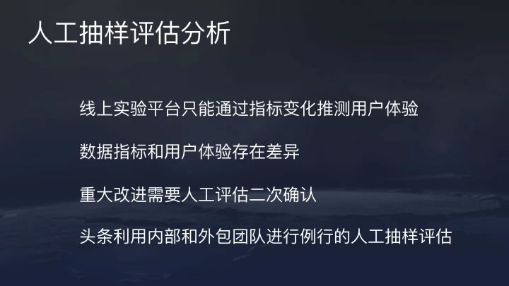 當然,只有實驗平臺是遠遠不夠的。線上實驗平臺只能通過數(shù)據(jù)指標變化推測用戶體驗的變化,但數(shù)據(jù)指標和用戶體驗存在差異,很多指標不能完全量化。很多改進仍然要通過人工分析,重大改進需要人工評估二次確認。
