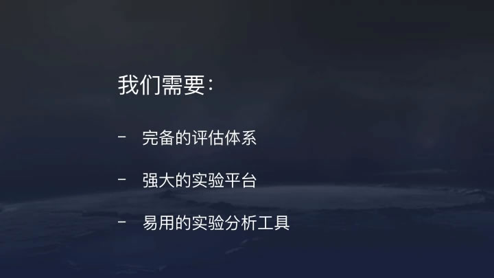 全面的評估推薦系統(tǒng),需要完備的評估體系、強大的實驗平臺以及易用的經(jīng)驗分析工具。所謂完備的體系就是并非單一指標衡量,不能只看點擊率或者停留時長等,需要綜合評估。過去幾年我們一直在嘗試,能不能綜合盡可能多的指標合成唯一的評估指標,但仍在探索中。目前,我們上線還是要由各業(yè)務比較資深的同學組成評審委員會深入討論后決定。