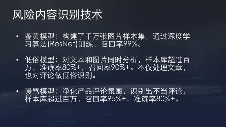 分享內(nèi)容識別技術(shù)主要鑒黃模型,謾罵模型以及低俗模型。今日頭條的低俗模型通過深度學習算法訓練,樣本庫非常大,圖片、文本同時分析。這部分模型更注重召回率,準確率甚至可以犧牲一些。謾罵模型的樣本庫同樣超過百萬,召回率高達95%+,準確率80%+。如果用戶經(jīng)常出言不諱或者不當?shù)脑u論,我們有一些懲罰機制。