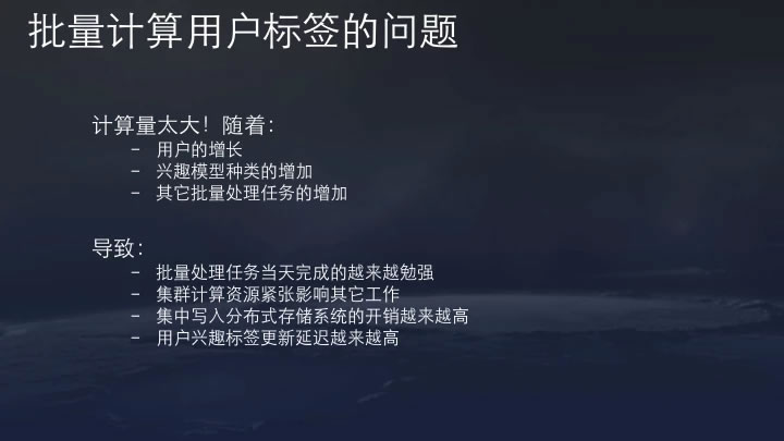但問題在于,隨著用戶高速增長,興趣模型種類和其他批量處理任務都在增加,涉及到的計算量太大。2014年,批量處理任務幾百萬用戶標簽更新的Hadoop任務,當天完成已經(jīng)開始勉強。集群計算資源緊張很容易影響其它工作,集中寫入分布式存儲系統(tǒng)的壓力也開始增大,并且用戶興趣標簽更新延遲越來越高。