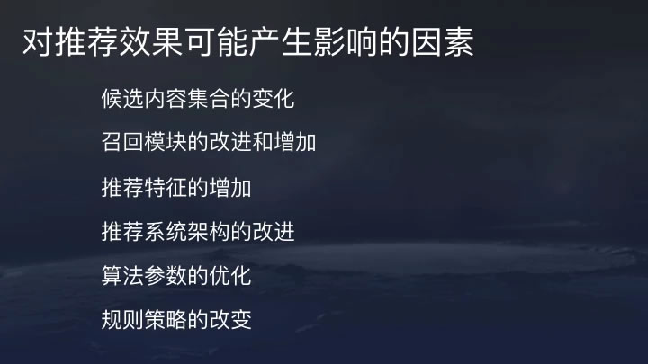 事實上,很多因素都會影響推薦效果。比如侯選集合變化,召回模塊的改進或增加,推薦特征的增加,模型架構(gòu)的改進在,算法參數(shù)的優(yōu)化等等,不一一舉例。評估的意義就在于,很多優(yōu)化最終可能是負向效果,并不是優(yōu)化上線后效果就會改進。