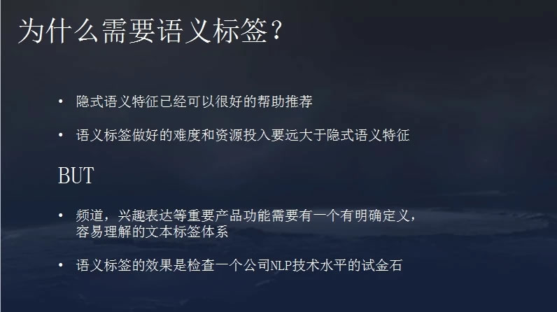 目前,隱式語義特征已經(jīng)可以很好的幫助推薦,而語義標簽需要持續(xù)標注,新名詞新概念不斷出現(xiàn),標注也要不斷迭代。其做好的難度和資源投入要遠大于隱式語義特征,那為什么還需要語義標簽?有一些產(chǎn)品上的需要,比如頻道需要有明確定義的分類內(nèi)容和容易理解的文本標簽體系。語義標簽的效果是檢查一個公司NLP技術(shù)水平的試金石。