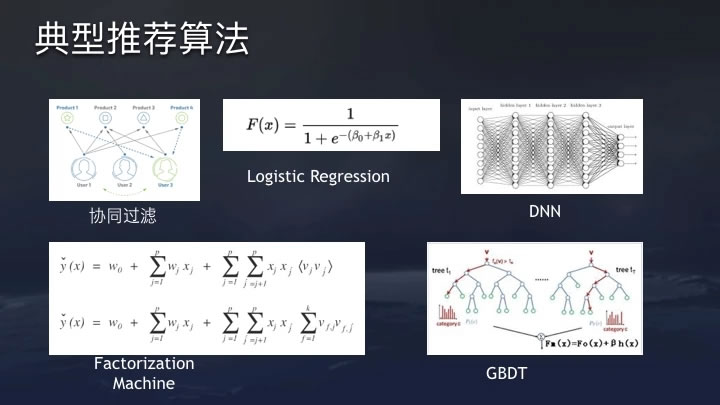 前面提到的公式y(tǒng) = F(Xi ,Xu ,Xc),是一個很經(jīng)典的監(jiān)督學習問題。可實現(xiàn)的方法有很多,比如傳統(tǒng)的協(xié)同過濾模型,監(jiān)督學習算法Logistic Regression模型,基于深度學習的模型,F(xiàn)actorization Machine和GBDT等。