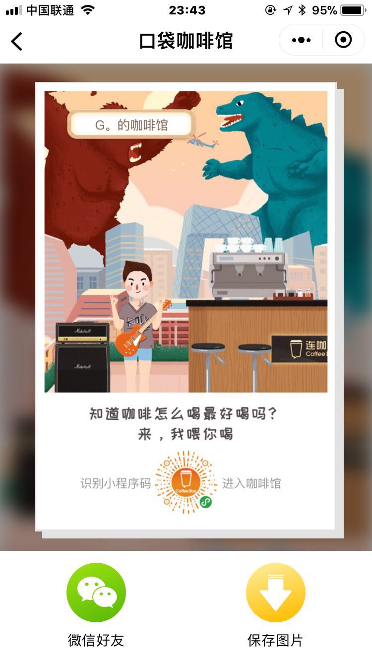 用戶可以生成圖店鋪的圖片或者自家店鋪咖啡圖片(均帶有小程序碼),保存到相冊里,通過此圖片,可以分享到各個平臺。打破了微信信息孤島問題。