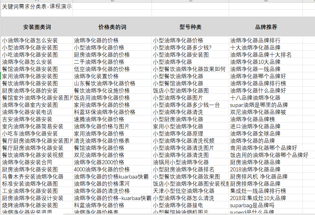 當我們獲得大量的關鍵詞數據后,我們經過篩選得到一些與自己的企業產品相關的關鍵詞,去掉垃圾詞,關鍵詞詞庫表示例如下:
